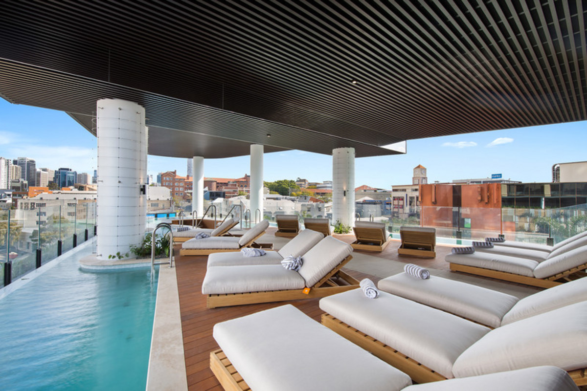 – Relaxation by the infinity pool, complete with pool bar and views over Brisbane City.