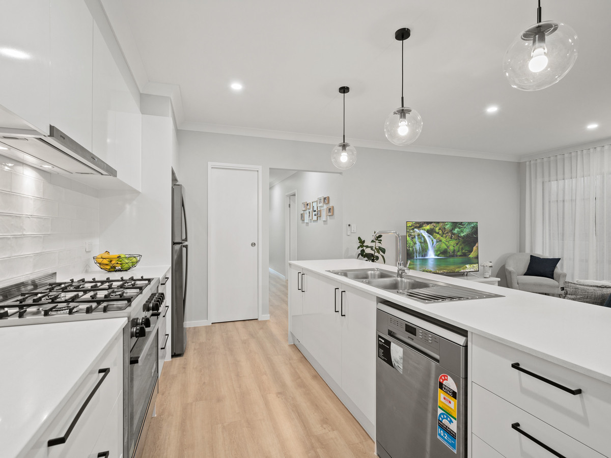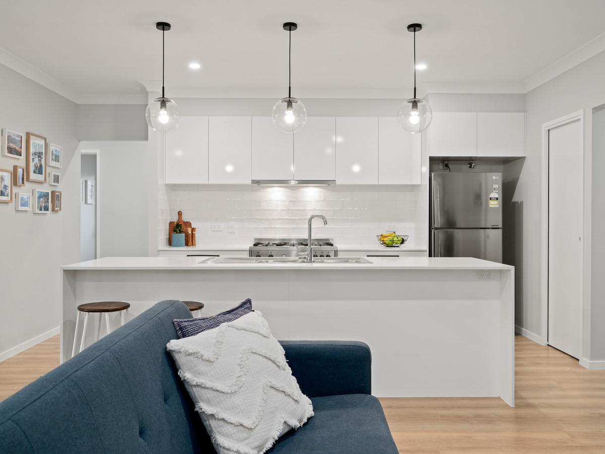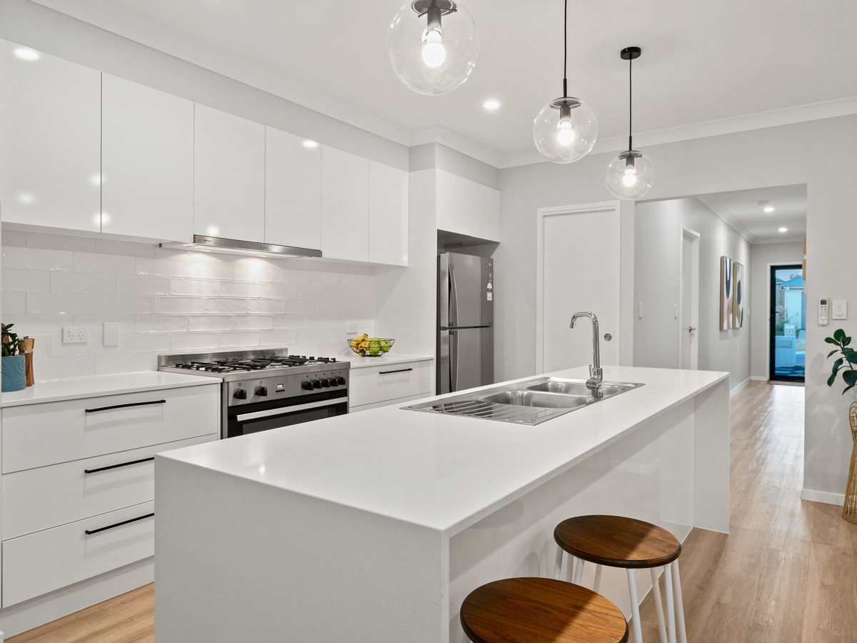 Step inside this stylish residence and you’ll immediately appreciate the generous proportions, quality finishes, and thoughtful design. The open-plan layout is anchored by a sleek modern kitchen featuring a waterfall stone island bench, 900mm freestanding gas cooker, subway-tiled splashback, and pendant lighting — perfect for the home chef or entertainer.