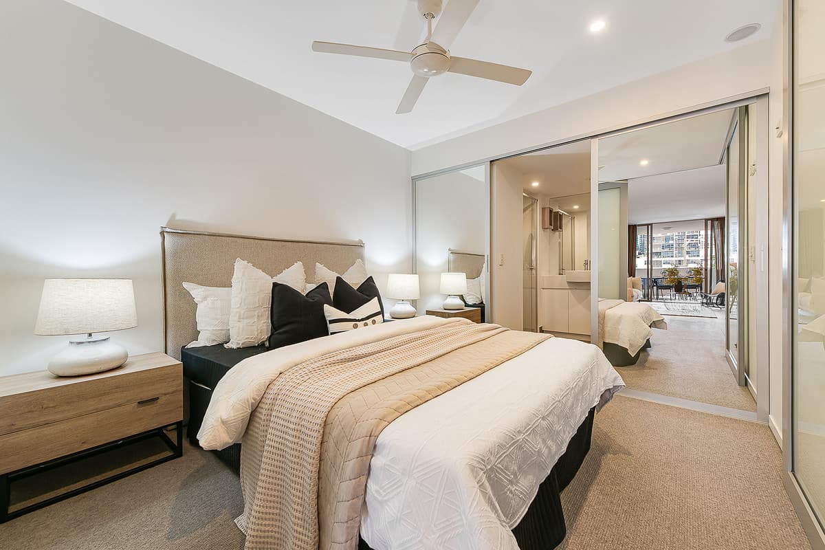 – Master bedroom with ceiling fan & built-in-robe and retractable sliding doors.