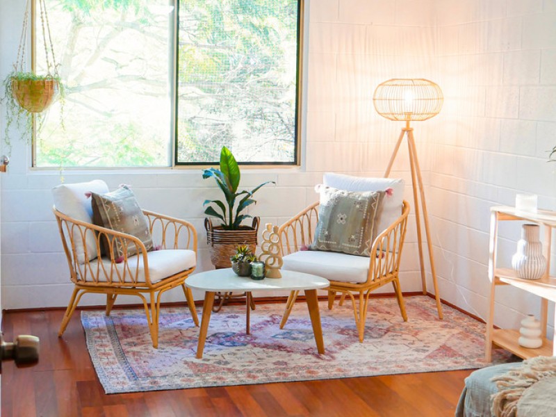 Double bed, double mattress, mattress protector, round side table, bedside lamp, book shelves, 2 armchairs with seat & back cushions and decorative cushions, rattan floor lamp, coffee table, large floor rug.